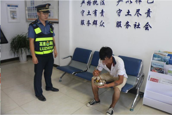 路政員載著小伙子到達(dá)錦屏高速路政辦公地點(diǎn)后,首先拿了礦泉水給小伙子喝,小伙子一口氣喝了兩瓶礦泉水。隨后路政員到大隊(duì)食堂盛了飯菜給小伙子吃,并告訴小伙子,餓的時(shí)間長了,吃飯要慢慢的吃,別著急,別吃的太快而傷到胃了。同時(shí)開導(dǎo)小伙子,遇到困難時(shí)要勇于和家人親人朋友聯(lián)系,不要覺得不好意思,抹不開面子,而獨(dú)自面對(duì)困難,萬一出了什么事家人會(huì)更加擔(dān)心的。隨后路政員帶著小伙到高速交警處,由交警聯(lián)系戶籍地派出所,再聯(lián)系小伙的家人。