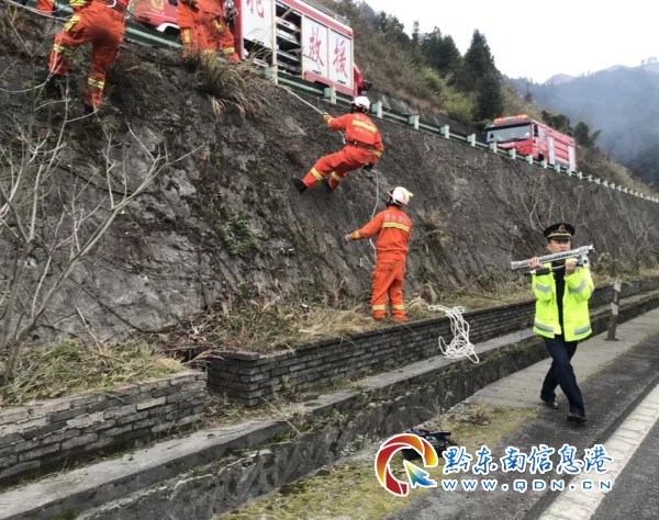 由于事故地點(diǎn)劍河往臺(tái)江方向交通擁堵,為確保第一時(shí)間救助被困人員,消防救援人員在警戒后確保安全情況下翻越圍欄高坎進(jìn)行救援。