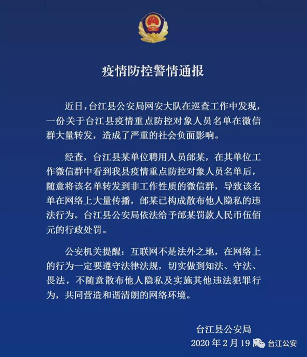 臺(tái)江公安通報(bào)一起疫情期間涉嫌散布他人隱私的行政處罰案件