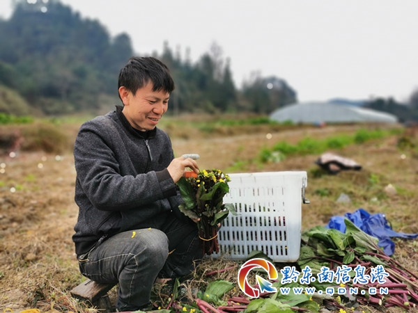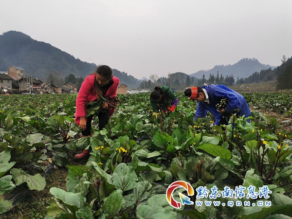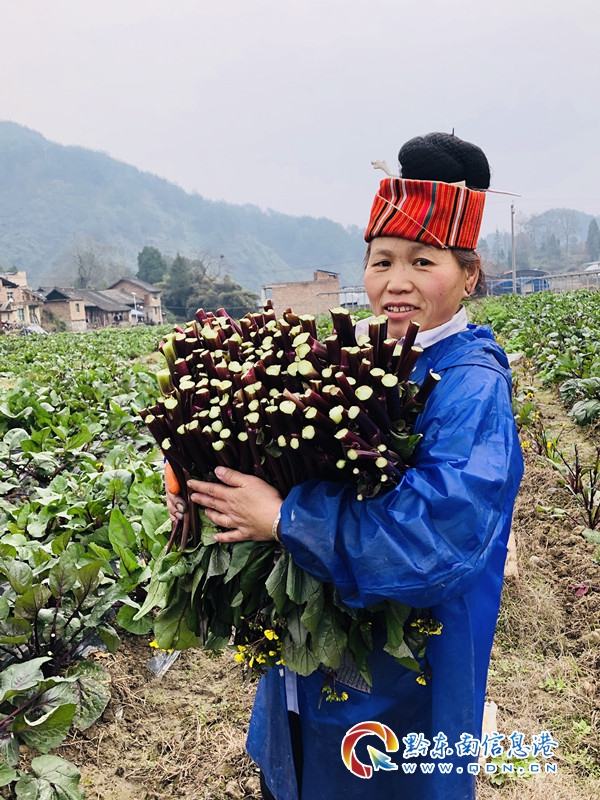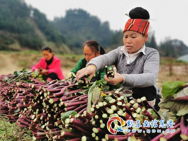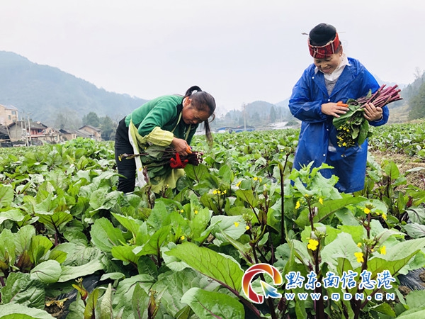 2019年12月,秋收后的舊州大壩進入了“冬眠期”,為充分利用舊州大壩,實現(xiàn)變“廢”為“寶”,施洞鎮(zhèn)積極與貴州哈耘農(nóng)業(yè)發(fā)展有限公司對接,采取“公司+合作社+貧困戶”模式發(fā)展紅菜苔種植項目,公司提供菜籽、地膜,合作社組織村民種植,再由公司統(tǒng)一按市場價回購,短短2個月的時間,紅菜苔迎來了大豐收。