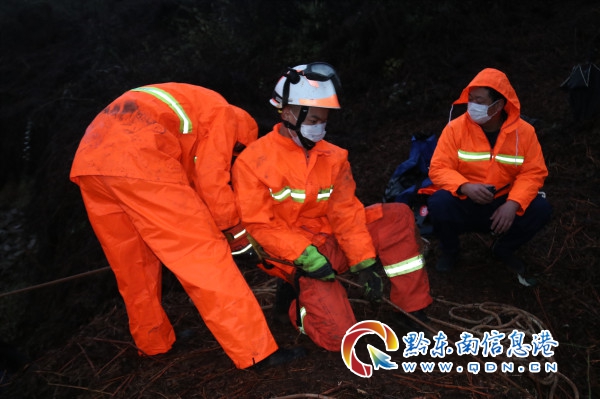 經指揮員現場研判,由一組救援人員利用救援繩索,選定可靠位置做好固定點,由一名經驗豐富的隊員在繩索的保護下佩戴空氣呼吸器,攜強光手電、有毒氣體探測儀、對講機、安全吊帶等必要裝備下洞偵查。