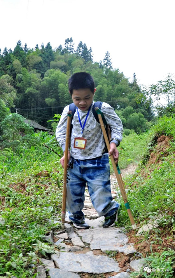 上學后,陶錢堅持自己拄拐杖去學校讀書,陶錢家距離學校雖然才1公里,但有一段坡度達40度的山路,這對于一個普通人來說算不了什么,然而他卻要拄著雙拐走上1個多小時。遇到特殊天氣,他有時還摔到水田里,弄得一身泥。可是兩年時間里,他卻沒有落下一節課,陶媽媽楊金元回憶說:“兒子好學的勁頭,我感到很高興,可是每次看到他摔跤、栽跟斗,就像刀扎進心窩,只好暗自流淚。”