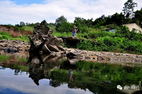 陶錢在家鄉上小學時,每天來到斷橋上等待母親背他過河。(唐安平 攝)