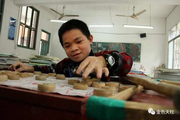 在天柱三中讀書時,全班同學都去上體育課去了,陶錢一個人就在教室左手與右手對弈。(唐安平 攝)