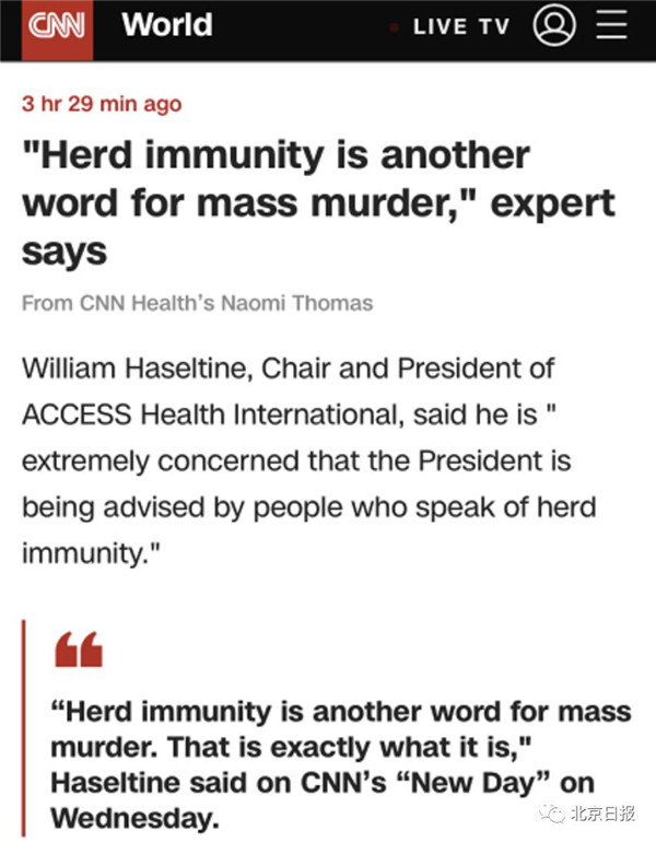 美國科學家威廉 · 哈茲爾廷于當地時間 14 日接受美國媒體采訪時表示,對 " 群體免疫 " 的說法非常擔心,并認為 " 群體免疫 " 是屠殺的另一種說法,這是無可爭辯的事實,假如像特朗普政府所倡導的那樣,如果用這種方式允許新冠病毒傳播,美國每年都將有兩百到六百萬美國人死亡。