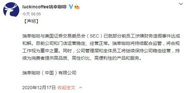消息,瑞幸咖啡(北京)有限公司官方微博 17 日發布聲明稱,瑞幸咖啡與美國證券交易委員會(SEC)已就部分前員工涉嫌財務造假事件達成和解。目前公司和門店運營穩定、經營正常。瑞幸咖啡將持續配合監管,將合規工作視為重中之重。同時,公司管理層和全體員工將繼續保持公司穩定經營,持續為消費者提供高品質、高性價比、高便利性的產品和服務。據悉,SEC 稍早前表示,針對造假指控,瑞幸咖啡同意支付 1.8 億美元罰款以達成和解。