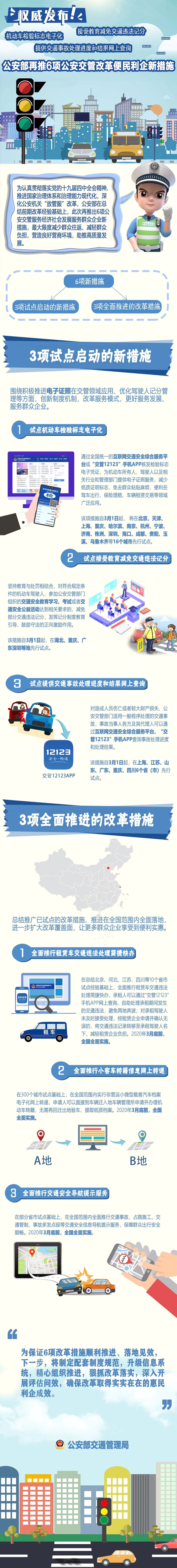 公安部交通管理局局長李江平通報,公安部在總結前期改革經驗的基礎上,此次再推出6項改革新措施,包括3項試點推行改革措施、3項全面落實改革措施。3項試點啟動的措施主要是圍繞積極推進電子證照在交管領域應用、優化駕駛人記分管理等方面。