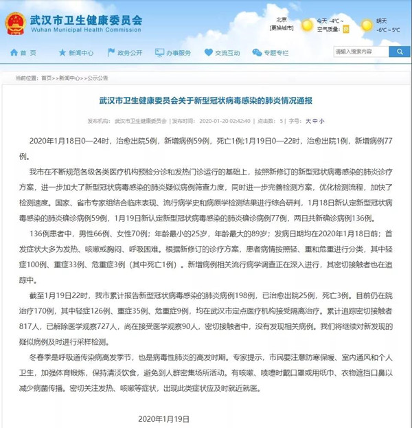 武漢:新型冠狀病毒感染肺炎病例兩天新增136例