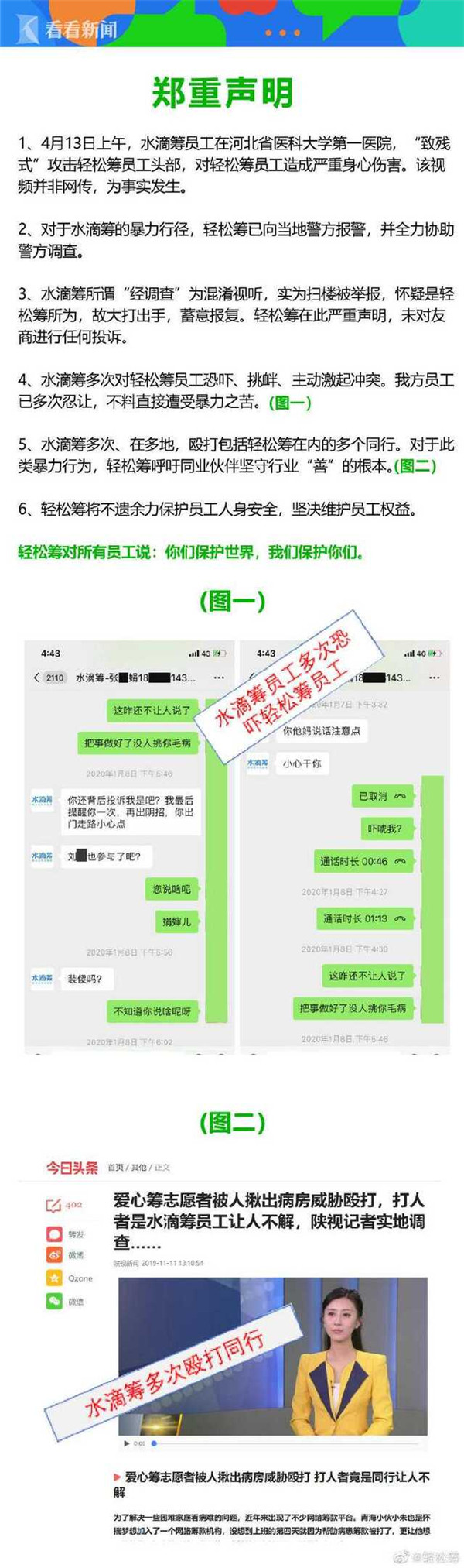 水滴籌在聲明中稱,近期,輕松籌團(tuán)隊(duì)內(nèi)部以水滴籌為假想敵,公開張貼“干死水滴籌”的攻擊性標(biāo)語,并且明確針對(duì)水滴籌開展了一系列不規(guī)范的挑釁、騷擾和破壞小動(dòng)作,致使線下連續(xù)發(fā)生數(shù)起雙方糾紛和沖突事件。水滴籌多次呼吁良性競(jìng)爭(zhēng),但溝通無果。4月1日,輕松籌山西運(yùn)城地區(qū)員工齊某因破壞水滴籌宣傳物料,被水滴籌員工師某制止后,對(duì)師某大打出手導(dǎo)致師某鼻骨骨折、臉部多處受傷;4月12日,輕松籌福建廈門員工杜某破壞水滴籌宣傳物料,被當(dāng)?shù)鼐教幚恚壳耙殉鼍叩狼感疟硎敬诵袨橄递p松籌公司領(lǐng)導(dǎo)指示下所為。