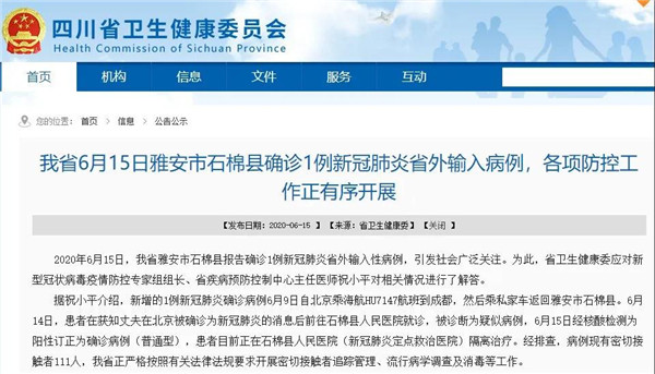 新增的1例新冠肺炎確診病例6月9日自北京乘海航HU7147航班到成都,然后乘私家車返回雅安市石棉縣。