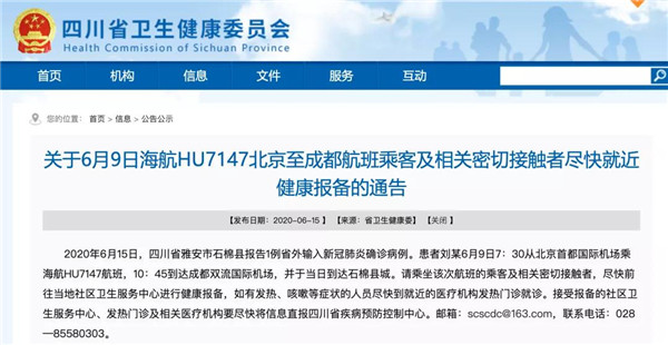 四川省應對新冠肺炎疫情應急指揮辦公室6月15日發布通告,緊急尋找6月9日海航HU7147北京至成都航班乘客及相關密切接觸者。
