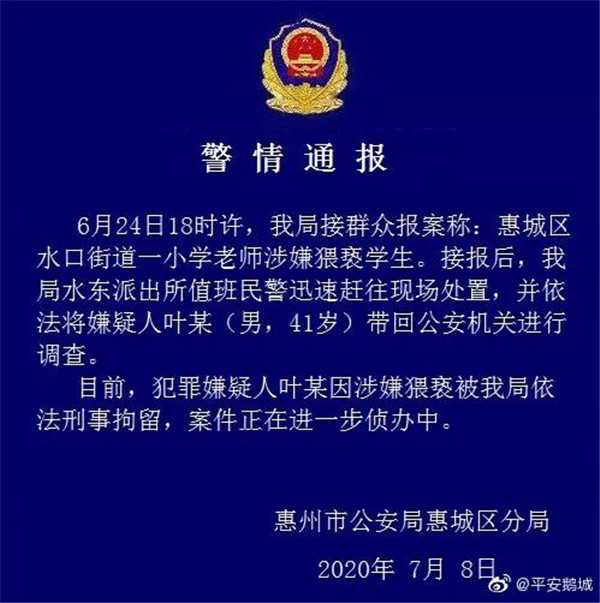 6月24日18時(shí)許,我局接群眾報(bào)案稱:惠城區(qū)水口街道一小學(xué)老師涉嫌猥褻學(xué)生。接報(bào)后,我局水東派出所值班民警迅速趕往現(xiàn)場(chǎng)處置,并依法將嫌疑人葉某(男,41歲)帶回公安機(jī)關(guān)進(jìn)行調(diào)查。