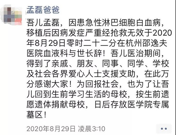 “吾兒孟磊,搶救無效今晨與世長辭……為回報社會,也為了讓吾兒回到生前學習生活的母校,按其遺愿遺體捐贈母校。”