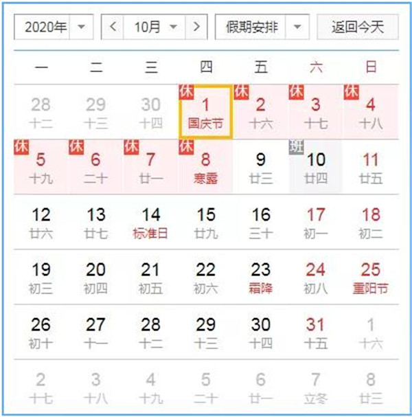 從9月2日起,十一黃金周火車票已經正式開售,根據國務院辦公廳通知精神2020年國慶節、中秋節放假安排通知如下:10月1日(星期四)至8日(星期四)放假調休,共8天。9月27日(星期日),10月10日(星期六)上班。