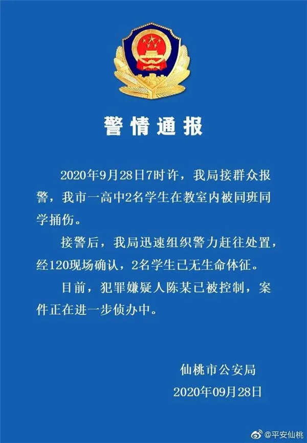 28日7時許,湖北省仙桃市公安局接群眾報警,一高中2名學生在教室內被同班同學捅傷。