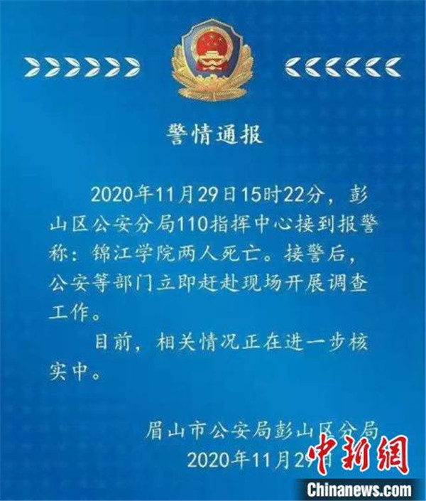 警方通報,11 月 29 日 15 時 22 分,彭山區公安分局 110 指揮中心接到報警,稱錦江學院兩人死亡。接警后,公安等部門立即趕赴現場開展調查工作。