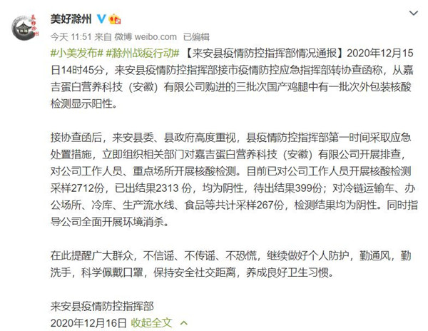 2020 年 12 月 15 日 14 時(shí) 45 分,來(lái)安縣疫情防控指揮部接市疫情防控應(yīng)急指揮部轉(zhuǎn)協(xié)查函稱,從嘉吉蛋白營(yíng)養(yǎng)科技(安徽)有限公司購(gòu)進(jìn)的三批次國(guó)產(chǎn)雞腿中有一批次外包裝核酸檢測(cè)顯示陽(yáng)性。