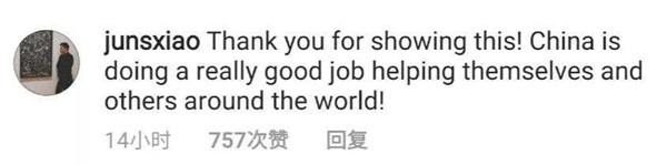 她的分享得到 " 海王 " 飾演者杰森 · 莫瑪、瑞安 · 雷諾茲等國外眾多明星的點贊,有網友留言表示 " 中國在自救和幫助世界各國方面,真的做得很棒!" 該留言也獲得眾多國外網友點贊!