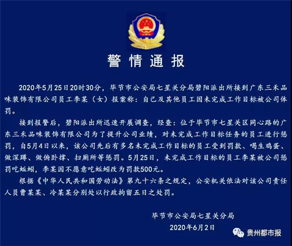 5月29日,封面新聞視頻報道,貴州畢節(jié)某裝飾公司員工業(yè)績不達標(biāo)懲罰多位員工。懲罰制度中員工未摘旗、未簽單、未帶單,都會被罰蚯蚓、吃泥鰍或請全員吃早餐。
