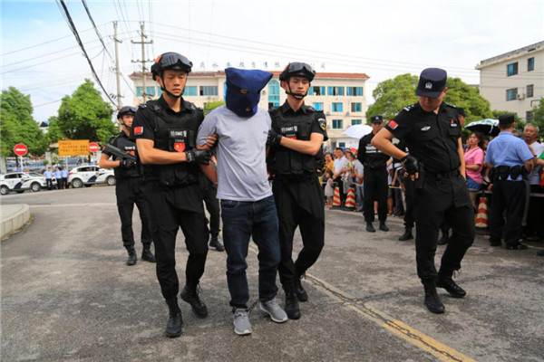 2020 年 6 月 15 日下午,犯罪嫌疑人成某某在余慶縣公安民警的押送下來到人民會場旁指認犯罪現場。
