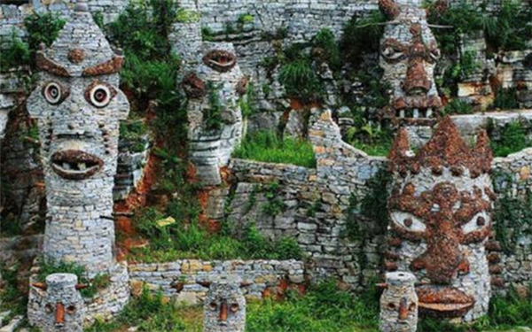 如今,在夜郎谷中,由石頭堆成了巨大的人像遍布四處,尤其是在河流的兩岸。這些巨人像的樣子一點都不像現(xiàn)在的人。據(jù)說,是宋培倫專門查閱了大量的文獻,將儺戲中的面具和人物作為巨石像的臉譜。