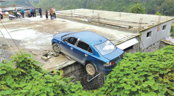 10月8日,冊亨縣公安局交警大隊冗渡中隊接到村民報警稱,在該鎮南俄村坡佑組一名新手女司機在倒車過程中,將一輛轎車開到居民樓房頂,懸掛半空中,現場情況十分危急,請交警前往處置。