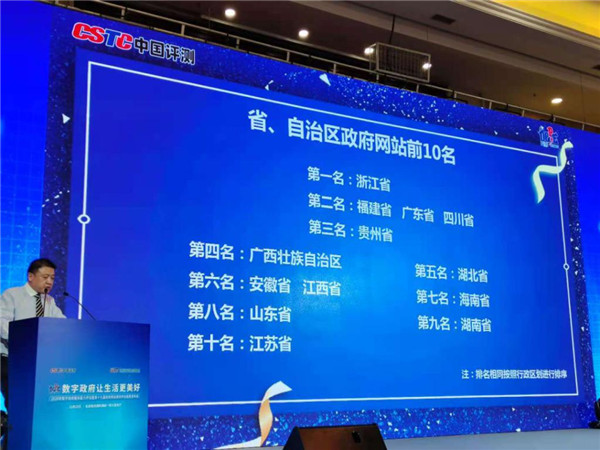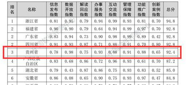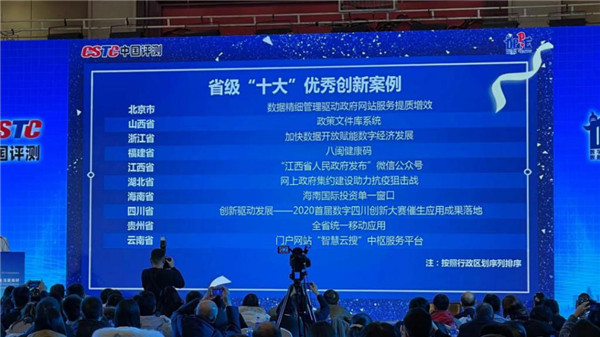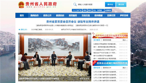 12 月 15 日,由中國軟件評測中心主辦的 "2020 年數字政府服務能力評估暨第十九屆政府網站績效評估結果發布會 " 在京召開,會上發布了 "2020 年數字政府服務能力評估暨第十九屆政府網站績效評估結果 ",貴州省人民政府門戶網站位列省、自治區政府網站第三名,數據開放單項指數以高分位列第一。