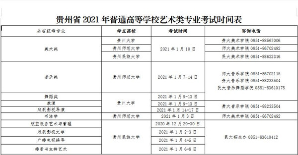 貴州省 2021 年普通高等學校藝術類專業考試時間及考點地址已經公布,請廣大考生注意!