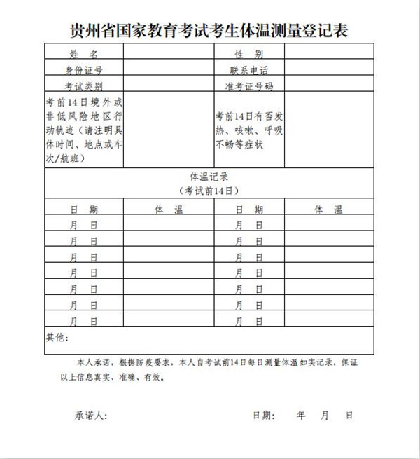 二、考生從考前第 14 天開始,每日測量體溫并進行健康狀況監測,填寫《貴州省國家教育考試考生體溫測量登記表》(以下簡稱《登記表》)。體溫測量記錄異常以及身體出現發熱(體溫高于 37.3 ℃)、干咳、乏力、鼻塞、流涕、咽痛、腹瀉等癥狀的,考生要報告所在學校或報名所在地市級或縣級招生考試機構。