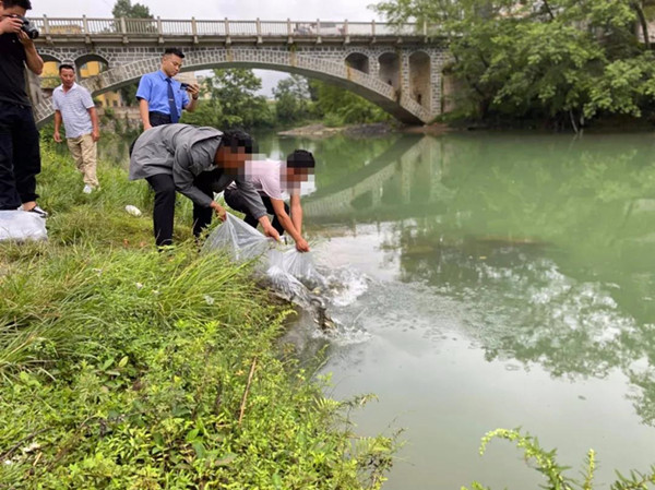 據介紹,9月9日,龍某、蔡某二人花2000元購買了草魚、鯉魚、白鰱等魚苗共1000余尾前往龍江河投放。鎮遠縣檢察院檢察官根據《中華人民共和國刑法》第三十七條之規定,對龍某、蔡某非法捕撈水產品一案在龍江河岸當場作出不予起訴的處理決定。派出所民警、農業農村部門工作人員及龍某、蔡某共同將魚苗投放進龍江河中。該案的處理方式得到群眾認可,起到了良好的宣傳教育效果。