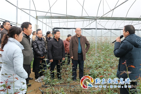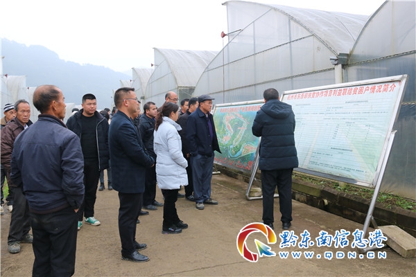 考察組一行來到青溪鎮雞鳴村石井基地,鎮黨委書記成元勛向考察組成員們詳細介紹基地建設情況、土地流轉方式、種植品種及規模、發展規劃、貧困戶利益聯結方式等方面,考察組成員們觀看基地展板并詢問相關問題,標準化的大棚建設,規范化的基地管理、專業化的技術指導,大棚里的玫瑰花苞已紛紛套袋,種植的蔬菜長勢良好,一片綠油油。