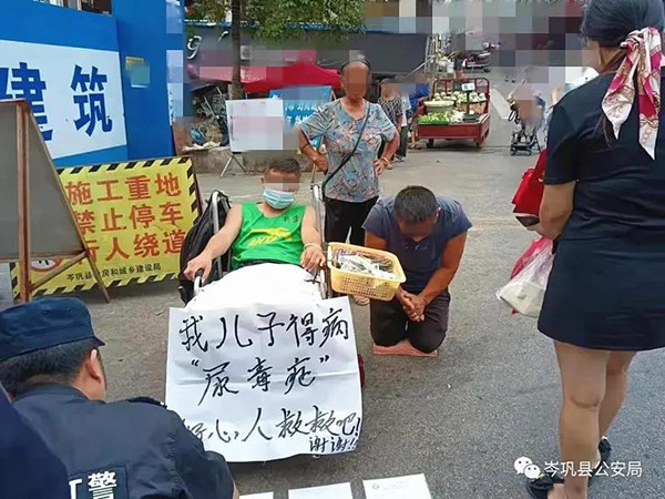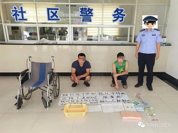 9月14日上午11時許,岑鞏縣公安局特巡警大隊巡邏民警在岑鞏縣㵲水街道農(nóng)貿(mào)市場門口發(fā)現(xiàn)一名中年男子跪在地上,以其身旁坐在輪椅上的兒子王凱身患尿毒癥需要大量的錢財治病的信息廣告,向路人進行乞討;經(jīng)現(xiàn)場詢問,民警發(fā)現(xiàn)二人非?梢,遂將二人口頭傳喚到岑鞏縣公安局新興派出所作進一步調(diào)查核實。