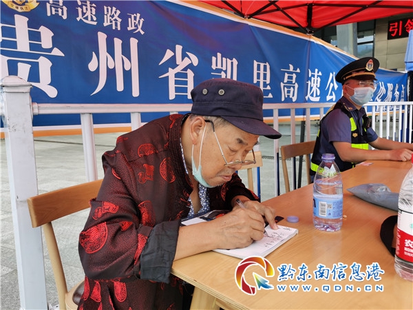 本網訊 2021年5月2日11時許,在G76廈蓉高速肇興服務區的“五一”便民服務點,一位老人文思泉涌、筆下生花,為正在現場值守的從江高速路政工作人員“作詩”點贊,成為一道溫馨而獨特的風景線。