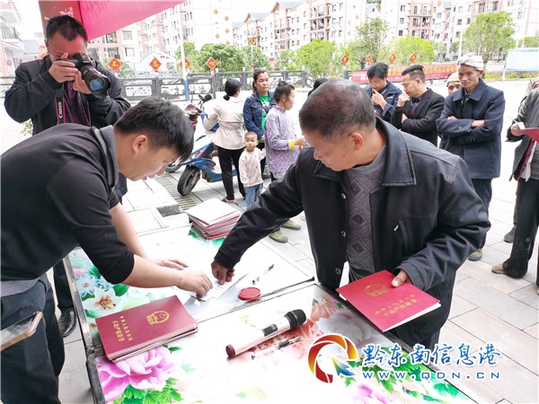 本網訊 5月20日,從江縣貫洞鎮貴運社區熱鬧非凡,首批易地扶貧搬遷安置住房不動產權證書頒發儀式在這里舉行,為社區62戶易地扶貧搬遷戶頒發了易地扶貧搬遷安置住房不動產權證書。