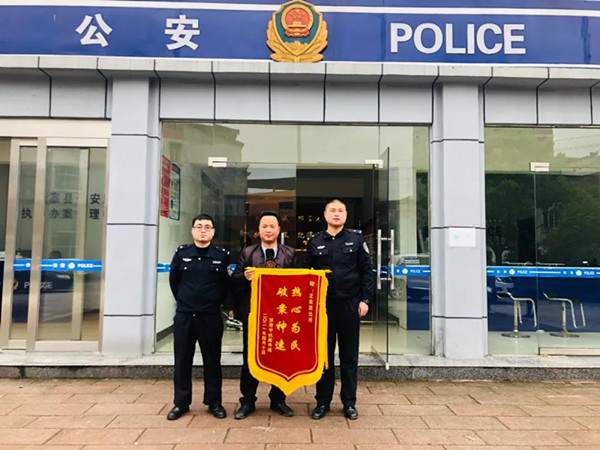 4月12日,失主陸先生得知手機被追回,滿心歡喜地向民警贈送了一面“熱心為民破案神速”錦旗表示感謝!