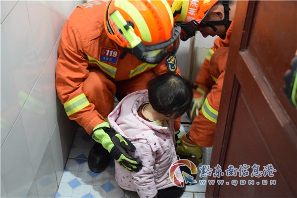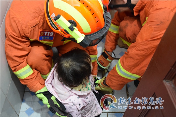 抵達現場后發現,小女孩右腳被卡蹲便器下水口中,無法取出,指揮員一邊安撫小女孩一邊在仔細查看小女孩腳被卡住的位置,為防止二次傷害,消防指戰員對小女孩右腳進行保護,再利用一根細小的棍子將小女孩鞋子緩慢脫掉,經過5分鐘的緊張救援,小女孩成功脫險,救援過程中小女孩表現勇敢,積極配合。(歐品江)