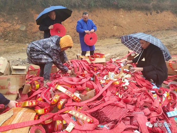 2月9日下午,黃平縣公安局治安大隊對行動中收繳的非法煙花爆竹在黃平縣城郊五里墩進行集中銷毀,縣委常委、政法委書記彭光明,縣人民政府副縣長、局黨委書記、局長李輝到現(xiàn)場督導(dǎo)銷毀。