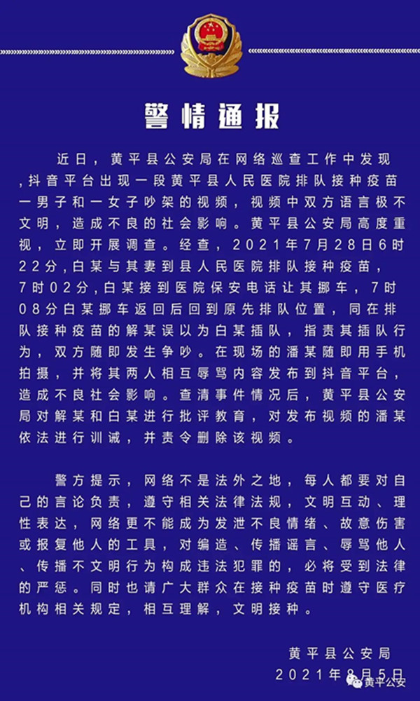 排隊打疫苗引發糾紛,黃平縣公安發布警情通報!