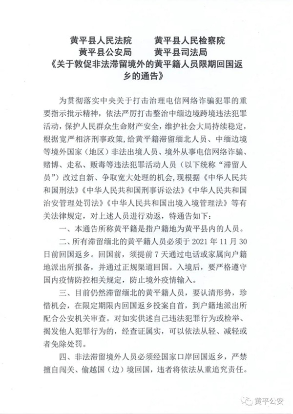為貫徹落實中央關于打擊治理電信網絡詐騙犯罪的重要指示批示精神,依法嚴厲打擊整治中緬邊境跨境違法犯罪活動,保護人民群眾生命財產安全,維護社會大局持續穩定,根據寬嚴相濟刑事政策,給黃平籍滯留緬北人員、中緬邊境等境外國家(地區)非法出境人員、境外從事電信網絡詐騙、賭博、走私、販毒等違法犯罪活動人員(以下統稱“滯留人員”)改過自新、爭取寬大處理的機會,現根據《中華人民共和國刑法》《中華人民共和國刑事訴訟法》《中華人民共和國治安管理處罰法》《中華人民共和國出境入境管理法》等有關法律規定,對上述人員進行勸返,特通告如下: