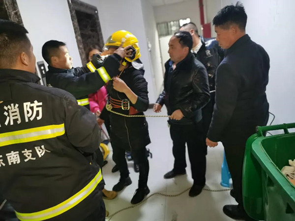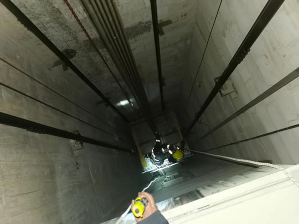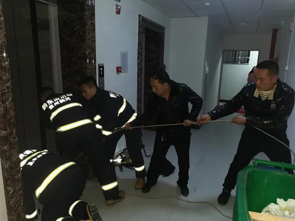 在確定營救方案后,指揮員命令由一名經驗豐富的消防員從三樓索降至電梯轎廂上,通過空隙教被困人員系好繩索,由三樓消防員合力將其吊上三樓,通過近30分鐘的救援,成功將被困者從電梯轎廂內成功解救出來。