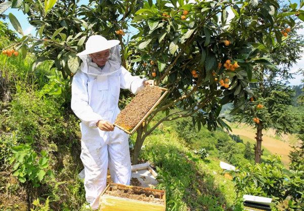 如今,果園里枇杷壓滿了枝頭,蜂箱里掛滿了蜂蜜,蜂群們自由自在地嬉戲于果園間,不斷采來甜蜜的致富希望,繪出一副果農、蜂農雙豐收的熱鬧景象。