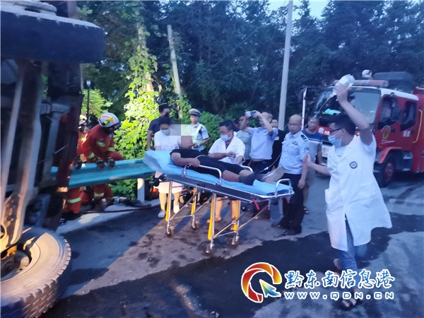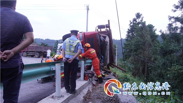 消防救援人員到達事故地點,經偵查,為一輛滿載木材貨車側翻在公路邊上,駕駛室嚴重變形,擋風玻璃碎片和木材散落一地,駕駛員腿部被卡在駕駛室內,無法動彈。