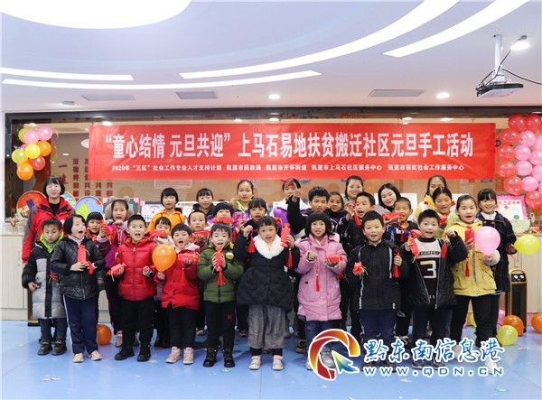 為了在易地扶貧搬遷社區(qū)弘揚(yáng)傳統(tǒng)節(jié)日文化、傳承民族手工、營(yíng)造節(jié)日氣氛。2020年12月31日,在節(jié)日到來之際,凱里市彩虹社會(huì)工作服務(wù)中心在凱里市上馬石社區(qū)四點(diǎn)半學(xué)校開展了一場(chǎng)迎元旦手工制作活動(dòng),參與本次活動(dòng)的社工及兒童共計(jì)30人。