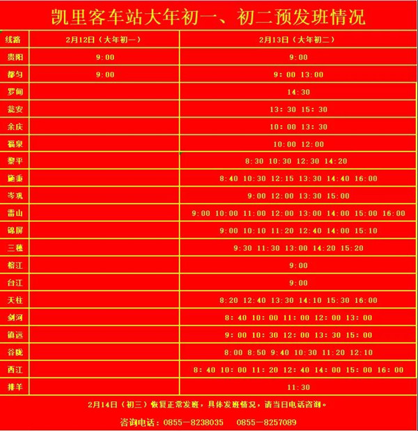 為確保春節期間廣大旅客走得安全、及時、有序,凱里城南客運站公布2月11日(農歷大年三十)及、2月12日(初一)、2月13日(初二)的班次時刻對外發布。請廣大旅客提前安排好自己的行程,以免影響您的出行計劃。