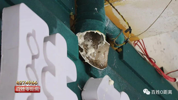 陳先生:原因是因為中博E棟的住戶水管常年沒有維修,堵了之后水不知道往哪里走,之后就不知道是誰家來把水管敲了,那天來敲的時候是星期六的晚上,但是這監控是壞的,找不到人,之后水就一直往下滴,一直滴了兩個月。