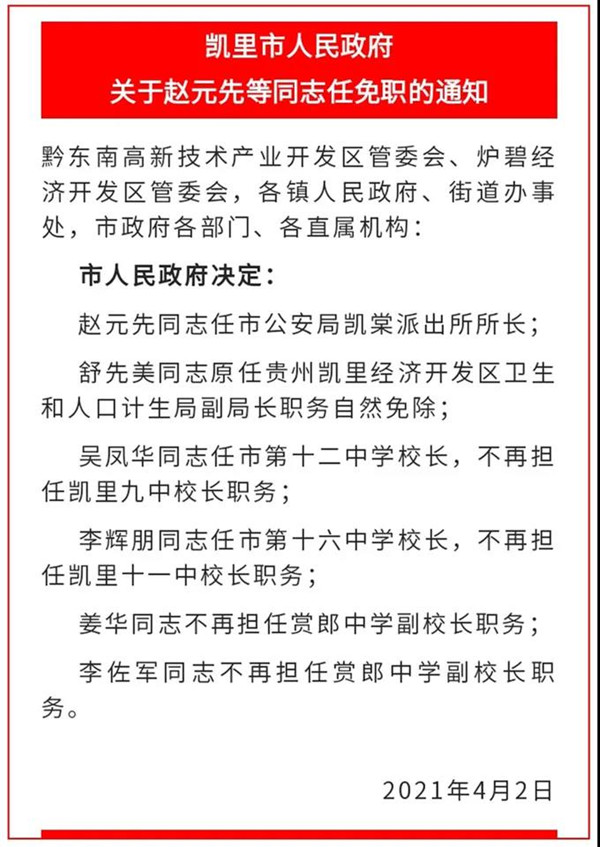 凱里市人民政府發布最新人事任免通知