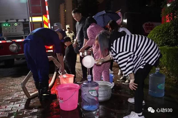 送水指戰(zhàn)員到盛世榮華小區(qū)時,提前得知消息的居民早已在雨中排起長隊等待接水。居民們感激的說:“消防員就像親人一樣,在人民最需要的時候為我們送來了及時雨”。消防指戰(zhàn)員在雨中連續(xù)奮戰(zhàn)12個小時,累計送水9車次共計54余噸,解決了小區(qū)內數(shù)千群眾的生活用水困難,受到了群眾的高度贊揚。