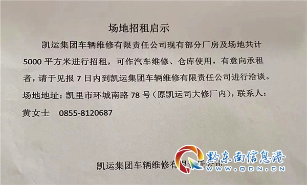 凱運集團車輛維修有限責任公司現有部分廠房及地共計5000平方米進行招租,可作汽車維修、倉庫使用,有意向承租者,請于見報7日內到凱運集團車輛維修有限責任公司進行洽談。