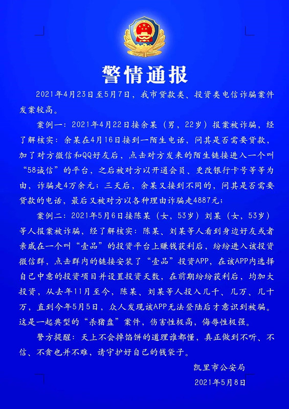 案例一:2021 年4月22日接余某( 男,22歲)報案被詐騙,經了解核實:余某在4月16日接到一陌生電話,問其是否需要貸款,加了對方微信和QQ好友后,點擊對方發來的陌生鏈接進入一個叫“58誠信”的平臺,之后被對方以開通會員、更改銀行卡號等等為由,詐騙走4萬余元;三天后,余某又接到不同的,問其是否需要貸款的電話,最后又被對方以各種理由詐騙走4887元。