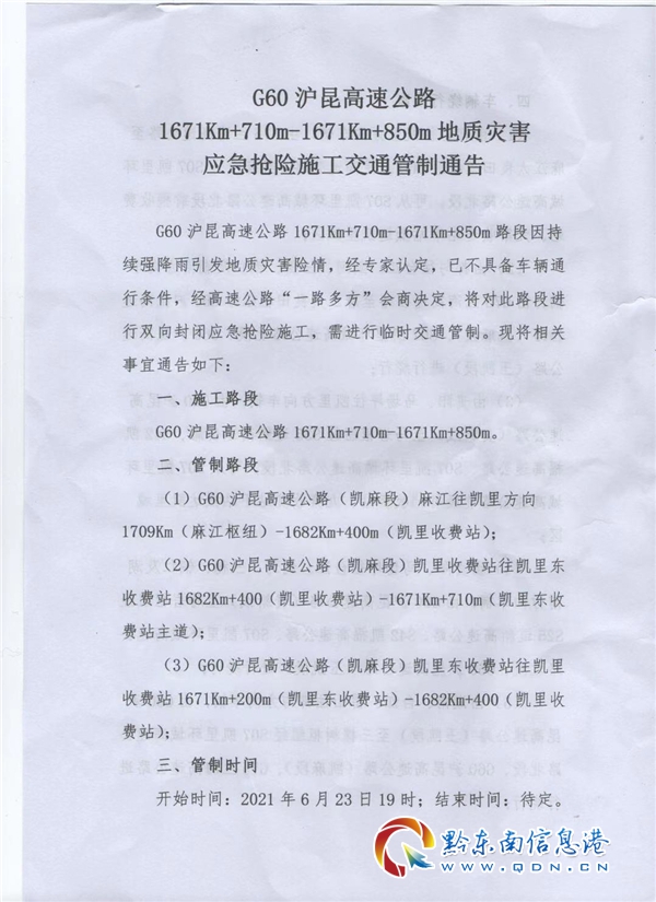 G60滬昆高速公路1671Km+710m-1671Km+850m地質災害應急搶險施工交通管制通告